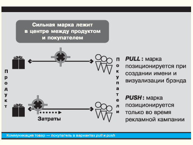 нужно одинаково грамотно пройти три этапа жизненного цикла марки: Поскольку компании начинают делать промахи с первого же этапа развития брэнда, уделим этому особое внимание. Наиболее серьезной и типичной ошибкой отечественных предприятий при создании марки является избегание потребностей, интересов и ожиданий целевой аудитории либо их подмена. Разработчиками позиционирования, названия, графического решения будущего брэнда могут быть руководство, дизайнеры, специалисты по рекламе. Про покупателей часто забывают. Иногда организуются фокус-группы, но, к сожалению, 8–10 человек не способны дать оценки, адекватные оценкам миллионов потребителей. Тем не менее, если вы сможете заглянуть в душу потребителя, понять товар через его сознание, то потребитель станет вашим единственным проводником к созданию сильного брэнда. Выявить рыночные возможности для будущей марки через потребителя позволяют маркетинговые исследования и комплекс специальных методик. Стратегии брэндинга В мировой практике существует два направления разработки и продвижения торговых марок. Pull (втягивать) — марка создается исходя из актуальных потребностей и ценностей и, выходя на рынок, находит спрос без массированной рекламы. Данный подход достаточно наукоемкий, но менее затратный по сравнению со вторым. Push (проталкивать) — в основе марки лежат признаки, дифференцирующие ее от конкурентов. При этом признаки, как правило, прямо не затрагивают актуальные потребности и ценности покупателей, часто навязывают их, и продвижение торговой марки невозможно без сильных рекламных бюджетов. В любом случае данный подход менее наукоемкий, но более затратный. Эти две стратегии сильно различаются на этапе позиционирования марки. В варианте pull марка позиционируется при создании имени и визуализации брэнда, push — только во время рекламной кампании. Если представить коммуникацию «товар — покупатель» в виде отрезка, то на одном конце будет продукт, на другом — потребитель (см. рисунок).