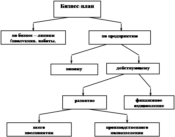 Виды бизнес-планов В зависимости от рыночной ситуации и цели составления бизнес – планы могут быть различны. Вследствие этого бизнес – планы по объектам бизнеса можно классифицировать в соответствии со схемой 1. (см. приложение) Бизнес – планы разрабатываются в различных модификациях в зависимости от назначения: по бизнес – линиям (продукция, работы, услуги, технические решения), по предприятию в целом (новому или уже действующему). Бизнес – план может быть нацелен как на развитие предприятия, так и на его финансовое оздоровление. Также может планироваться деятельность всего предприятия или его отдельного подразделения.