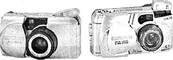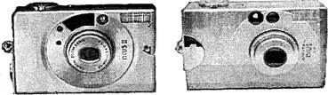 Рис. 1.4. Слева - пленочная камера Саnоn IXUS 11, справа – цифровая камера Canon Digital IXUS Рис. 1.5. Слева – пленочная камера Olympus ZOOM 115, справа – цифровая камера Olympus C - 990 ZOOM Как и следует ожидать, на внешнем виде сходство заканчивается даже такая, на первый взгляд, легко поддающаяся копированию часть пленочной камеры, как объектив, не годится для цифровой модели. Дело в том, что используемые в любительских цифровых фотоаппаратах ПЗС-матрицы значительно меньше тех, что применяются в профессиональных. Их размер не превышает 2/3 дюйма по диагонали, а наиболее часто встречаются матрицы с диагональю 1/2 дюйма. При этом оптика, перенесенная один в один с 35-мм камеры, дает изображение, значительно превосходящее по размерам ПЗС-матрицу. Кроме того, ЭОП обладают меньшей по сравнению с пленкой светочувствительностью, а с другой стороны, продолжительное воздействие яркого света губительно для них, что накладывает дополнительные ограничения на конструкцию затвора и светосильные характеристики оптики. ?Как ни прискорбно, до сих пор встречаются конструкции камер, оптика которых вызывает нехорошие воспоминания о дешевых китайских «мыльницах» с пластмассовыми линзами. Естественно, что никакие «мегапикселы» не помогут сформировать качественное изображение при эксплуатации таких моделей. В то же время появившиеся в 1998 году камеры с ЭОП на полтора миллиона элементов и хорошей светосильной оптикой до сих пор с успехом используются в достаточно сложных для съемки условиях, например при съемке в помещениях с плохой освещенностью. 2 Оптическая система Как уже было сказано, одной из основных составляющих фотоаппарата является его объектив. Поэтому необходимо упомянуть основные термины, касающиеся оптической подсистемы фотоаппарата. 2.1Объективы с постоянным и переменным фокусным расстоянием Чем больше фокусное расстояние, тем меньше угол зрения - предметов попадает в кадр меньше, но их размер в кадре больше. И наоборот, при уменьшении фокусного расстояния объекты съемки становятся меньше, но в кадр их попадает больше. Разумеется, что это также сказывается и на перспективе кадра - степени удаленности объектов друг от друга. Углу зрения обычного человека в 35-мм камерах соответствует фокусное расстояние 50 мм (46°). Часто фокусное расстояние для цифровой фотокамеры указывается двумя цифрами, например, 6-15 мм (28-72 мм). Это вызвано тем, что размер ЭОП меньше кадра обычной пленки, поэтому линейные размеры оптики тоже меньше. Для удобства восприятия вводится вторая величина, которая обозначает фокусное расстояние в эквиваленте 35-мм камеры. Для обозначения объективов с переменным фокусным расстоянием в англоязычной литературе применяется термин zoom, часто он калькируется в русских переводах словом «зум». Это неправильно, для объективов такого типа давно существует название вариообьектив. Под кратностъяю объектива подразумевают отношение максимального фокусного расстояния к минимальному, например, 105/35 = 3 – кратность объектива равна 3. Объективы, фокусное расстояние которых не изменяется, в англоязычной литературе называются fixed focus. В отечественной литературе такой тип оптики обозначается как объектив с постоянным фокусным расстоянием. Постоянное фокусное расстояние несколько ограничивает возможности фотографа, в то же время конструкция таких устройств пр