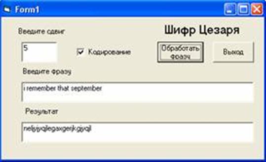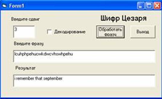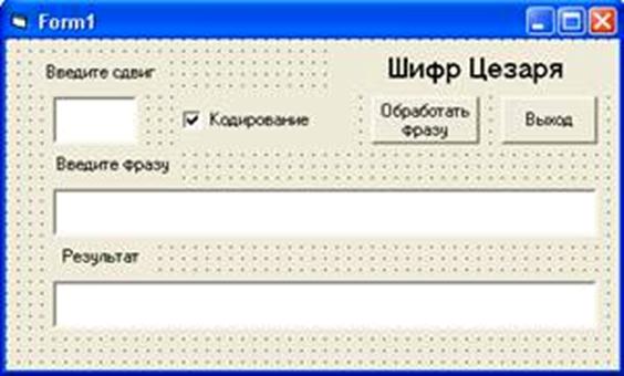 Пояснения к таблице: 1-я строка – фраза для шифрования; 2-я строка – номера букв фразы для шифрования в латинском алфавите; 3-я строка – номера букв фразы для шифрования, увеличенные на 3; 4-я строка – зашифрованная фраза. Спроектируем форму Form1, так чтобы было можно выполнять как кодирование, так и декодирование введенной фразы, рис. 1.