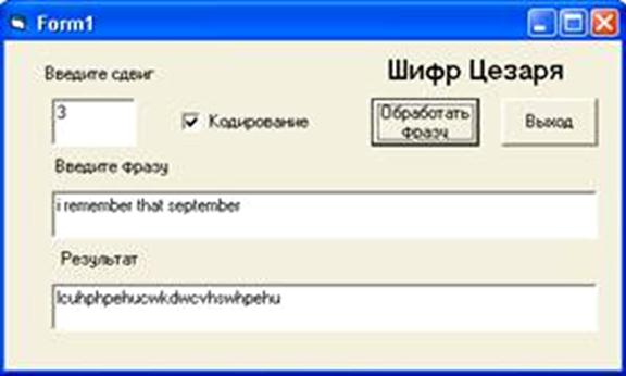 Private Sub Command2_Click() End End Sub Запустим программу на выполнение. Наберем число 3 в текстовом окне «Введите сдвиг», а в окне «Введите фразу»: i remember that September. Набор проводим строчными буквами, поскольку работа с прописными буквами в программе не предусмотрена. Проверив состояние контрольного индикатора (Кодирование), закодируем набранную фразу, щелкнув по кнопке «Обработать фразу». Результатом кодирования будет lcuhphpehucwkdwcvhswhpehu, рис. 2. Можно убедиться, что он совпадает с «найденным теоретически». Декодируем полученную шифровку. Для этого перенесем зашифрованную фразу lcuhphpehucwkdwcvhswhpehu из окна «Результат» в окно «Введите фразу» и изменим состояние контрольного индикатора (уберем флажок). Снова щелкнем по кнопке «Обработать фразу» и в окне «Результат» появится исходная фраза i remember that September, рис. 3. Теперь можно зашифровать ту же фразу для другого значения сдвига, пусть например kk = 5. Результат кодирования представлен на рис. 4.