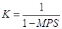 тобто, коли квадрат суми граничної схильності до споживання і акселератора буде менший від 4-х значень акселератора. Зворотне співвідношення (i-S)+a]' > 4а відображає рівномірне економічне зростання і можливе лише при великому коефіцієнті мультиплікатора. За сучасного рівня загального мультиплікатора, який, як відомо, близький до 2, гранична схильність до споживання (МРС) відображається коефіцієнтом величиною 0,3, що виводиться із формули мультиплікатора: