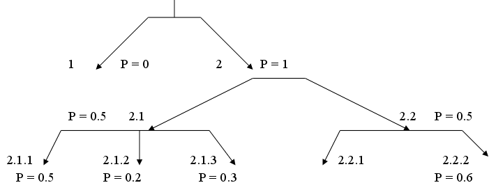 Р = 0.4 Схема 1.где 2.1 - использование резервного ферментера:2.1.1 - использование резервного ферментера в цехе №3 2.1.2 - использование резервного ферментера в цехе №2 2.1.3 - использование резервного ферментерав новом здании 2.2 - покупка нового ферментера 2.2.1 - установление ферментера в цехе №2 2.2.2 - установление ферментера в новом здании Таблица 1.