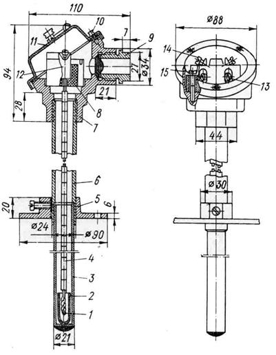Чувствительные элементы термометров, как правило, помещаются в тонкостенные металлические гильзы и герметизируются. Защитные корпуса термометров сопротивления обычно выполняются такими же, как и для термопар (см. рис. 14-17), — в виде защитной трубы с резьбовым штуцером и головкой, к зажимам которой терморезистор может быть присоединен двумя, тремя или че