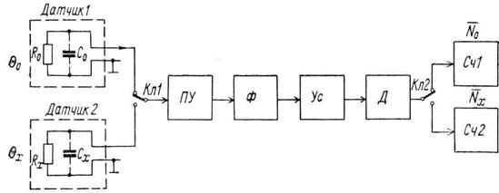 Измеряемая схема кварцевого термометра состоит из датчика, включенного в цепь положительной обратной связи усилителя, и частотомера. При добротности датчика до 3∙106 погрешность измерения температуры равна 10‑3 К. Существенным недостатком кварцевых термометров является их инерционность, составляющая несколько секунд, и нестабильность работы при Θ > 100 °С из-за возрастающей невоспроизводимости (более 10-7).