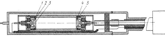 Конструкция датчика частотно-цифрового акустического термометра, разработанного в ЛПИ им. М. И. Калинина, приведена на рис. 13. В полости резонатора l электростатическим возбудителем 2 возбуждаются продольные акустические колебания, которые принимаются аналогичным по конструкции приемником 4. Использование электростатических преобразователей позволяет создать конструкции приемника и возбудителя, работоспособные как при низких (—100 °С), так и при высоких (+400 °С) температурах, обладающие равномерной характеристикой чувствительности в диапазонах частот акустических колебаний от 5 до 15 кГц. Мембраны 3 и 5 соответственно возбудителя 2 и приемника 4 толщиной 4 мкм выполнены из никеля методом электрохимического напыления и имеют собственную частоту около 30 кГц.