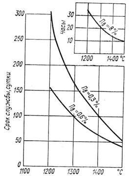 Зависимость срока службы термопар от пористости защитной оболочки (вещества) Пв показана на рис. 14.
