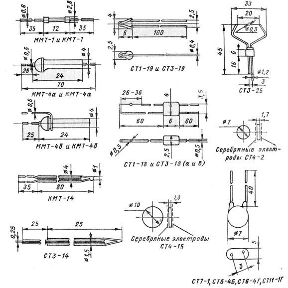 Особый интерес представляют миниатюрные полупроводниковые терморезисторы, позволяющие измерять температуру малых объектов с минимальными искажениями режима работы, а также температуру, изменяющуюся во времени. Терморезисторы СТ1-19 и СТЗ-19 имеют каплевидную форму. Чувствительный элемент в них герметизирован стеклом и снабжен выводами из проволоки, имеющей низкую теплопроводность. В терморезисторе СТЗ-25 чувствительный элемент также помещен в стеклянную оболочку, диаметр которой доведен до 0,5—0,3 мм. Терморезистор с помощью выводов прикреплен к траверсам.