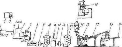 Рис. 1. Аппаратурно-технологическая схема поточно-механизированной линии для производства завернутой карамели с фруктовой начинкой Методы консервирования плодов и овощей (обеспложивающее фильтрование,ультрафиолетовое облучение) Порча пищевых продуктов, в частности плодов и овощей, вызывается главным образом действием микроорганизмов. Плоды и овощи, содержащие много влаги, и такие пищевые вещества, как сахара, органические кислоты, азотистые вещества, витамины, пектиновые вещества и т. п., являются хорошей питательной средой для микробов. Проникая в плоды и овощи, микроорганизмы начинают быстро размножаться и потреблять пищевые вещества. В процессе размножения и питания микробы разлагают ценные вещества растительного сырья с образованием спирта, кислот, а также ряда дурнопахнущих и ядовитых соединений, приводя к гибели плоды и овощи как живой организм и делая их непригодными для употребления в пищу. В качестве одного из примеров микробной порчи можно привести спиртовое брожение, вызываемое дрожжевыми организмами, а также некоторыми из плесневых грибов; суммарную реакцию спиртового брожения можно написать так: