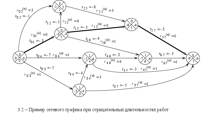 Реализация указанных правил даёт путь, состоящий только из работ с нулевыми полными резервами времени. Тогда, на основании теоремы 3.1 (утверждение-достаточность), этот путь и будет являться критическим. В целях проверки, доказанная методика применена для сетевого графика, представленного на рисунке Error: Reference source not found. Здесь, найденные критические пути, выделены жирными стрелками. Как видно, таких путей два, благодаря тому, что среди работ, исходящих из события 0, есть две работы с нулевыми полными резервами времени. Проверить то, что найденные пути являются критическими легко, просуммировав длительности принадлежащих им работ. Суммы окажутся: во-первых, равными между собой, а во-вторых, наибольшими среди аналогичных сумм других возможных путей. Теперь рассмотрим вопрос поиска наикратчайшего пути сетевого графика. Оказывается, для его поиска можно применять, методику поиска критического пути, если использовать идею, высказываемую в следующей теореме. Теорема 3.3 – Если произвести расчёт параметров заданного сетевого графика по установленным правилам, но заменяя известные длительности работ на те же значения с отрицательным знаком (длительности всех работ будут меньше нуля), то наикратчайший путь сетевого графика станет подчиняться всем свойствам критического пути. Эту теорему легко доказать, используя правило сравнения отрицательных чисел. Данное правило заключается в том, что одно отрицательное число считается большим другого, если абсолютное значение первого меньше абсолютного значения второго. Поскольку длительность наикратчайшего пути, по абсолютному значению наименьшая, среди длительностей всех других путей сетевого графика, то, на основании указанного правила, отрицательная длительность наикратчайшего пути будет наибольшей среди отрицательных длительностей остальных путей. Тогда, наикратчайший путь, состоящий из работ с отрицательными длительностями, будет критическим, при условии, что все остальные пути, также состоят из работ с отрицательными длительностями. Теорема доказана. Для проверки доказанной теоремы, параметры сетевого графика на рисунке Error: Reference source not foundпересчитаны заново, при отрицательных значениях длительностей работ, и представлены на рисунке Error: Reference source not found. Как видно, сетевой график на рисунке Error: Reference source not foundсодержит путь, работы которого имеют только нулевые полные резервы времени. Данный путь выделен жирными стрелками. Этот путь, являясь критическим для сетевого графика на рисунке Error: Reference source not found, в тоже время является наикратчайшим путем для сетевого графика на рисунке Error: Reference source not found. Последнее можно проверить простым суммированием длительностей его работ. Полученная сумма должна быть наименьшей по абсолютному значению, среди аналогичных сумм других путей сетевого графика на рисунке Error: Reference source not found. Вообще говоря, для нахождения продолжительности наикратчайшего пути, необходимой при анализе оптимальности сетевого графика по критерию (1.1), не обязательно суммировать длительности всех, принадлежащих ему работ. Она уже известна из рассчитанных, при отрицательных длительностях работ, параметров сетевого графика, и равна, как и для любого критического пути, сроку свершения завершающего события. Естественно, что данный срок свершения имеет отрицательное значен