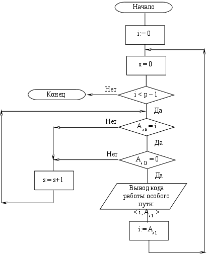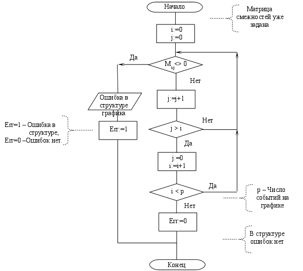 Любопытно заметить, что если последнее из перечисленных свойств не выполняется, то в сетевом графике есть петли, то есть, работы, концы которых являются началами других работ, предшествующих первым по времени, при условии, что все события занумерованы, верно. Из этого следует возможность легкой автоматизации на ЭВМ процесса проверки правильности построения сетевого графика. Данный процесс проверки, алгоритмически, представляется в виде блок-схемы 4. . Суть алгоритма проверки заключается в определении содержимого элементов нижней диагональной части матрицы смежностей. Если там встретится хотя бы одна единица, то это будет означать, что сетевой график построен неправильно – либо в нем есть петли, либо события занумерованы не верно.