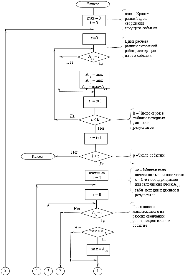 Блок-схема 4. – Алгоритм расчета ранних сроков свершения событий сетевого графика