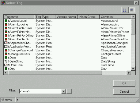 В любое время в режиме проектирования можно открыть список переменных приложения щелчком по кнопке Select для выбора соответствующей переменной, просмотра списка или модификации атрибутов. Диалог Select Tag (выбор переменной) представлен на рис.11.