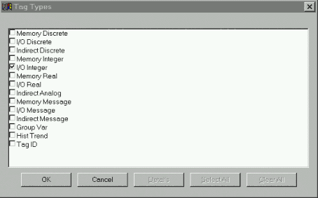 Группа алармов (Alarm group, рис.11) для переменной определяется в диалоге, вызываемом нажатием кнопки Group диалога Tagname Dictionary. Все, что касается алармов, рассматривается в соответствующем разделе ниже. Выбор типа переменной осуществляется в диалоге Tag Types (тип переменной, рис. 12), вызываемом на экран нажатием кнопки Туре диалога Tagname Dictionary.