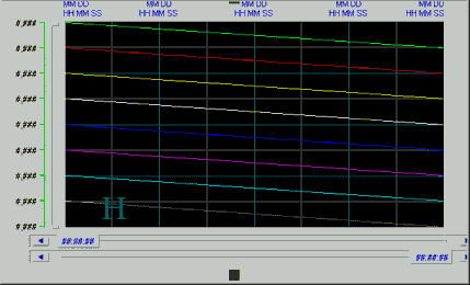 При создании тренда реального времени настройки его конфигурации устанавливаются по умолчанию (настройки предыдущего тренда). Для конфигурирования тренда реального времени следует либо дважды щелкнуть на созданном объекте, либо, предварительно выбрав объект, запустить команду Special/Animation Links. На экране появится диалог Real Time Trend Configuration (конфигурирование тренда реального времени). Среди настроек этого диалога можно отметить диапазон времени, охватываемый трендом (Time Span), частоту вывода значение переменной (Interval), разрешение сетки по большим и малым делениям горизонтальной и вертикальной осей (Time Division, Value Division), цвета фона и рамки графика (Color). Конфигурирование перьев тренда включает выбор имени переменной или выражения, цвета и толщины линии для каждого пера (поле Expression). Для повышения производительности системы следует отметить опцию Only update when in memory (обновлять, когда в памяти). В этом случае обновление данных тренда будет производиться только в моменты, когда окно с трендом отображается на дисплее (находится в RAM). Есть и другие способы повышения производительности при работе с трендами реального времени (уменьшение толщины линии графика, уменьшение частоты выводы значений переменной). Например, если установлен диапазон времени (Time Span) в 30 минут, а частота вывода - 2 секунды, то число измерений, которые нужно провести за каждые 30 минут, будет равно 900 (30 * 60/2 = 900). При частоте выводе в 5 секунд число измерений существенно уменьшается: 30 * 60/5 = 360. Исторические (архивные) тренды не являются динамическими. Они обеспечивают "снимок" состояния данных за прошедшее время, то есть по архивным данным. В отличие от трендов реального времени исторические тренды обновляются только по команде - при запуске скрипта, изменении значения выражения или нажатии оператором соответствующей кнопки. При конфигурировании архивного тренда можно создать "визиры" (ползунки, бегунки), с помощью которых удобно получить значения всех отображаемых переменных на один и тот же момент времени. Бегунки архивного тренда представляют собой позиционные индикаторы на временной оси, положение которых определяет объем извлекаемых данных. Связав объект "движковый регулятор" с полем бегунка, можно осуществлять перемещение вдоль архивного тренда. Кроме того, имеются функции вычисления среднего, минимального и максимального значений в определенном бегунком положении. Можно создать правый и левый бегунки и производить обработку данных кривой, расположенной между бегунками. Вычисляются следующие величины: среднее, минимальное, максимальное, отношение мин/макс и стандартное отклонение. В зависимости от положения бегунков на оси можно реализовать и другие функции (увеличение и уменьшение заключенной между бегунками области графика). Благодаря системе распределенных архивов на один и тот же график можно выводить информацию из нескольких баз данных. Все сказанное выше о механизме создания тренда реального времени инструментом Real Time Trend в среде разработки WindowMaker и о его последующем конфигурировании можно отнести и к архивному тренду, создаваемому инструментом Historical Trend среды разработки. Предлагаемый ниже способ создания и конфигурирования архивного тренда предполагает использование мастер-средств библиотеки Wizard. Нажатие