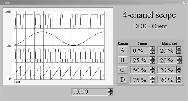 созданы, и могут многократно использоваться в других скриптах InTouch. Список Name содержит имена всех определенных к данному моменту скриптов Quick Functions. Щелчок по имени скрипта выводит его текст в рабочее поле диалога. Команда Scripts/New предназначена для создания нового скрипта и вызывает на экран диалог для ввода его имени. После щелчка по Ok новое имя будет включено в список имен Name. Следующий этап - определение аргументов нового скрипта в таблице Arguments диалога Quick Function. В левую колонку таблицы вводят имя аргумента (до 31 символа), в правую - его тип (Integer, Real, Discrete, Message). В одном скрипте допускается до 16 аргументов. После определения типов аргументов можно приступать к написанию текста скрипта Quick Function в рабочем поле (под таблицей Arguments). Разработка графопостроителя в системе InTouch Данный раздел посвящен разработке четырехканального графопостроителя визуализирующего данные, поступающие по DDE каналу с DDE сервера. В программе предусмотрена возможность масштабирования по каждому из каналов. Разработка DDE-сервераПриложение, получающее данные из другого приложения по DDE и/или управляющее другим приложением с помощью команд через DDE является DDE-клиентом. В этом случае второе приложение является DDE-сервером. Рассмотрим проект DDE-сервера, выполненного на языке программирования Borland Delphi 6. На рис.20 представлено окно DDE-сервера во время дизайна в среде Delphi