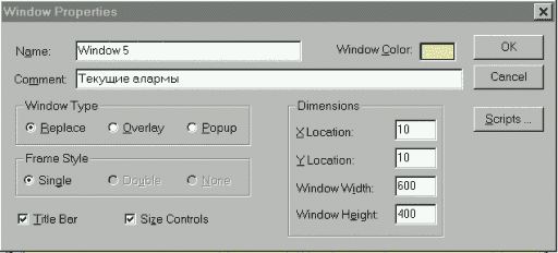 Проект, созданный в пакете InTouch, представляет собой набор окон (Window) с различными графическими и текстовыми объектами. Окна в InTouchСвойства каждого окна (наличие заголовка, цвет фона, размеры и т. д.) определяются при его создании. Создание нового окна производится в среде разработки WindowMaker щелчком по иконке панели инструментов General или командой File/New Window. На экране появится диалог Window Properties (Свойства окна, рис. 2).