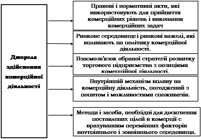 Рис. 1. Основні джерела здійснення комерційної діяльності підприємства. Функції комерції обумовлені взаємодією з ринками, споживачами, конкурентами й іншими елементами зовнішнього середовища. Отримані вихідні дані з внутрішніх і зовнішніх джерел трансформуються в інформацію, на основі якої здійснюється комерційна діяльність у торговому підприємстві (рис. 1). В міру становлення ринку передбачається проведення коректувань у системі управління комерційною діяльністю на основі всебічного аналізу діяльності торгового підприємства і факторів зовнішнього середовища. У зарубіжній практиці виділяються два аспекти комерції: один зв'язаний з діяльністю служби комерції, а інший - із забезпеченням взаємних інтересів між структурними підрозділами підприємства і комерційною службою. У рамках першого аспекту діяльність служби комерції орієнтована на один з наступних варіантів: товари; функції; товарні ринки і покупці; товари і функції; функції і товарні ринки. З цього переліку переважають варіанти по товарах і по функціях. Розглянемо структуру управління комерційним підрозділом у цих двох варіантах. На рис. 2 зображена структура управління комерційною службою, до складу якої входять комерційні групи, спеціалізовані по товарній ознаці. У кожній групі зосереджена визначена номенклатура товарів. Ці групи здійснюють закупівлю і продаж товарів з урахуванням потреб покупців і скорочення витрат обігу.