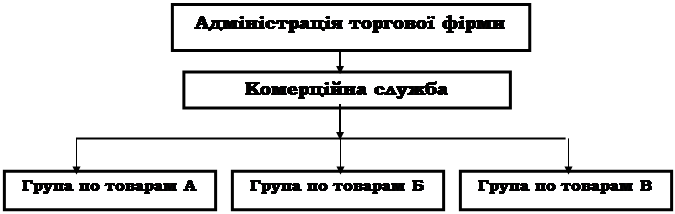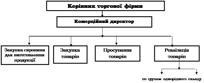 Рис. 2. Структура управління комерційною службою по товарній ознаці. На рис. 3 представлена структура управління комерційним підрозділом, що діє по функціональній ознаці. Весь ланцюжок обігу продукції представлений чотирма блоками, кожний з який наділений властивими йому функціями, у тому числі і комерційними. Перший блок забезпечує закупівлю сировини для виготовлення продукції на своїх підприємствах, що потім надходить у продаж. Другий блок здійснює прямі закупівлі товарів у виробників для наступної реалізації. Третій блок зв'язаний із просуванням товарів, супроводжуваним складуванням і збереженням. Четвертий блок виконує операції по підготовці товарів до продажу і подачі до місць продажу. Усі товари, що надходять у продаж, групуються по однорідній ознаці. Комерційна діяльність координується і контролюється комерційним директором, що підпорядковується керівнику торгової фірми (компанії).