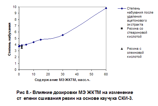 Как видно из рис. 3-7, и таблиц 12-17 с ростом содержания олеохимиката в резиновой смеси наблюдается изменение физико-механических характеристик резин: снижение условных напряжений при заданном удлинении и условной прочности при растяжении, но однородность резин растет. Такая картина имеет место как для резин, свулканизованных в оптимуме, так и для резин, свулканизованных в течение одинакового времени (30 минут при температуре 143°С), причем уровень падения изучаемых характеристик меньше для резин, свулканизованных в оптимуме. Степень сшивания резин, определяемая по величине набухания резин в толуоле, снижается с увеличением дозировки МЭЖКТМ в резине (рис. 8, табл. 18). Следует отметить, что уровень физико-механических характеристик резин с МЭЖКТМ и стеариновой и олеиновой кислотой практически одинаков, а однородность анализируемых резин выше по сравнению с контрольными резинами. Таким образом, на основании полученных данных можно предварительно заключить, что олеохимикаты (на примере МЭЖКТМ) в резиновых смесях и вулканизатах могут выполнять функции диспергатора ингредиентов, вторичного активатора вулканизации резиновых смесей, технологической добавки и мягчителя. Таблица 18 - Влияние содержания метилового эфира ЖКТМ на величину ацетонового экстракта и степень набухания ненаполненных резин на основе каучука СКИ-3 Режим вулканизации: температура 143°С, время 30 минут.