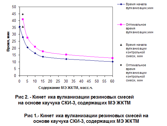 Таблица 45 - Влияние олеохимикатов на кинетику вулканизации при испытании на реометре Монсанто наполненных резин на основе каучуков СКИ-3, СКД и СКМС-30АРКМ15 Температура испытания 143°С