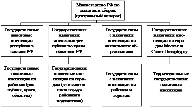 Рис.1.1. Система органов Министерства Российской Федерации по налогам и сборам Федеральная служба налоговой полиции РФ осуществляет контрольные функции путем, выявления предупреждения и пресечения налоговых поступлений и правонарушений. Налоговый контроль следует рассматривать как функциональный элемент и основную форму налогового администрирования. Он имеет все черты, присущие финансовому контролю, и одновременно обладает специфическими чертами, что проявляется в более узкой сфере действия. Налоговый контроль имеет государственный властный характер, он проявляется при осуществлении субъектами налогового контроля функций по контролю за исчислением и уплатой юридическими и физическими лицами налогов и других обязательных платежей в соответствии с действующим законодательством и нормативными актами. Особенностью является то, что субъектам налогового контроля предоставлено право внесудебного рассмотрения дел о применении финансовых и административных санкций. Государственный властный характер налогового контроля обусловлен спецификой налоговых правонарушений, основанных на фискальной функции налогов, а также нежеланием налогоплательщиков уплачивать налоги. В условиях недостаточно развитой организации налогового контроля, несовершенства налогового законодательства властность порождает жалобы налогоплательщиков на решения налоговых органов, неприятие действующей налоговой системы. При постоянном росте потребностей государства в финансовых средствах механизм сбора налогов должен работать бесперебойно. Если этого не происходит, налоговые источники иссякают, и государство вынуждено искать неналоговые поступления, возрастает внешний и внутренний долг государства. Недовольство политикой властей и нежелание платить налоги имеют глубокие исторические корни, что объективно требует постоянного совершенствования методов учета налогоплательщиков и сбора налогов. Налоговая система государства построена таким образом, что налогоплательщик определяется не выборочно, а подлежит учету. К уплате налогов привлекаются граждане и все хозяйствующие субъекты, среди которых проводится постоянная предупредительная работа, идентифицирование, отслеживаются объекты налогообложения. В ряде стран с развитой налоговой системой проводится идентифицирование потенциальных налогоплательщиков и учет их доходов с момента рождения и до конца жизни. Государство обязано создать прочную основу для организации и проведения налогового контроля, сделать его независимым. Независимость от местных властных органов в условиях коренной ломки экономических отношений, затрагивающих интересы всех хозяйствующих субъектов и большинства граждан, предполагает реализацию на практике проводимой в стране налоговой политики с использованием норм налогового права, а не субъективных решений и мнений. Практика стран с развитой налоговой системой, опыт Российской Федерации за истекшие 11 лет убедительно доказали необходимость использования специфических методов борьбы с сокрытием доходов и уходами от налогов (например, получение конфиденциальной информации о доходах, использование нетрадиционных источников информации). Для этих целей созданы специальные правоохранительные органы (налоговая полиция, служба расследовани