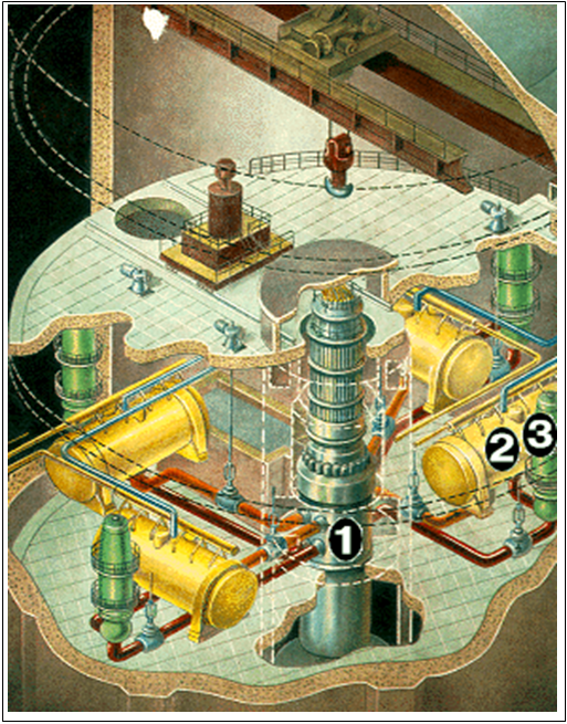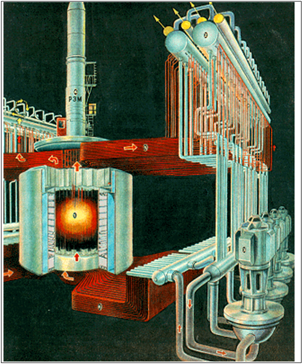 Итак, мы видим, что реакция действительно является самоподдерживающейся и циклической. Цикл жизни нейтронов схематично представлен на рис. 4. На данной схеме, в отличие от вышеприведенного описания рассмотрение начинается со стадии тепловых нейтронов. Можно вывести коэффициент размножения нейтронов в бесконечной гомогенной среде: K¥ = Ni+1/Ni = uтэф m j q - формула 4-х сомножителей. Для конечных сред можно ввести коэффициент Kэф = uтэф m j q P, где P - вероятность избежать утечки. На этом рассмотрение физических основ протекания цепной ядерной реакции в ЯР можно завершить. Используя описанную цепную ядерную реакцию, можно переводить энергию из формы энергии связи частиц в ядре в кинетическую энергию движения частиц, то есть в тепло. Как уже отмечалось ранее основную трудность представляет собой не организация цепной реакции, а получение чистых делящихся веществ и другие технические и технологические нюансы ядерной энергетики. 4. Принцип построения атомной энергетики.