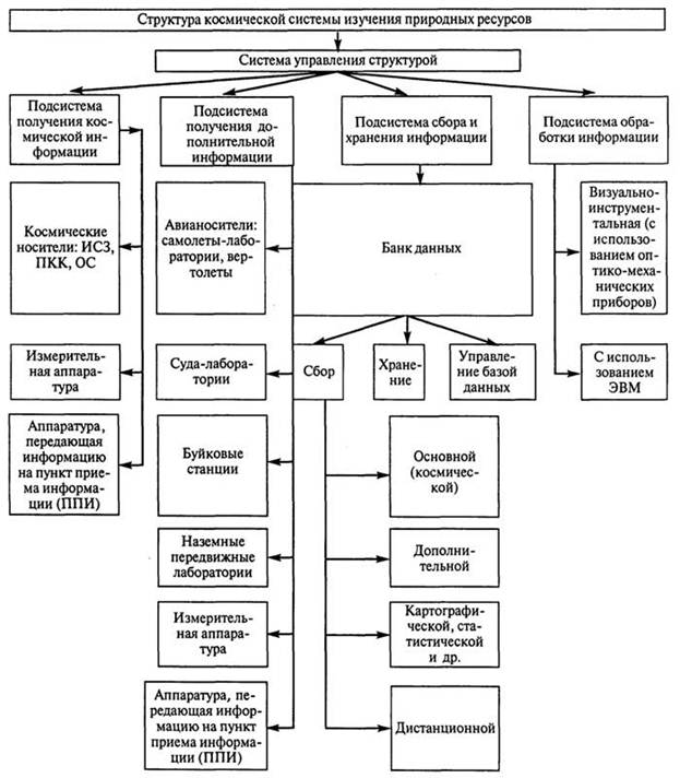 Рис. 2 Структура космической системы изучения природных ресурсов Земли Принципиально структура космической системы ИПРЗ состоит: из системы управления структурой; 4 основных подсистем: получения космической информации; получения дополнительной дистанционной информации; сбора и хранения информации; обработки информации. Подсистема получения космической информации включает: космические носители измерительной аппаратуры (искусственные спутники земли - ИСЗ), пилотируемые космические корабли (ПКК) и орбитальные станции (ОС). Принципиальная блок-схема структуры космической системы изучения природных ресурсов Земли (ИПРЗ) показана на блок-схеме 3. Структура космической системы ИПРЗ принципиально состоит из системы управления структурой и четырех основных подсистем: получения космической информации, дополнительной дистанционной информации, сбора и хранения информации, обработки информации. Подсистема