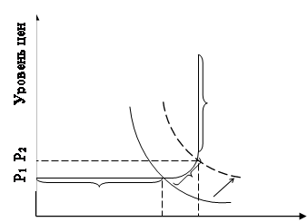 Проиллюстрируем инфляцию спроса (рис. 1.1.1.)1 Увеличение денежной массы по указанным выше причинам в течении короткого промежутка времени сдвигает кривую совокупного спроса вправо (АD1 ® AD2), и если экономика находится на промежуточном (2) или классическом (3) отрезках кривой совокупного предложения, то это ведет к росту цен, что представляет инфляцию спроса [6, c. 428]. Инфляция издержек - рост цен вследствие увеличения издержек производства. Причинами увеличения издержек могут быть олигополистическая политика ценообразования, экономическая и финансовая политика государства, рост цен на сырье, действия профсоюзов, требующих повышения заработной платы, и др. Проиллюстрируем механизм инфляции предложения (рис.1.1.2.).