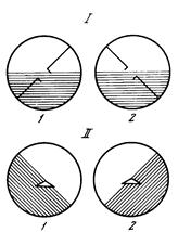 Рис. 2. Схематичное изображение авиагоризонта 1 — вид индикации "с земли на самолет": 1 — левый крен. 2 — правый крен; II — вид индикации "с самолета на землю": 1 — левый крен, 2 — правый крен Такой способ индикации пространственного положения самолета называют "вид с земли на самолет". На втором типе прибора представлен неподвижный силуэт самолета и перемещающаяся линия горизонта, которая не только уходит вверх или вниз, но и наклоняется вправо (при левом крене) или влево (при правом крене). Такую индикацию принято называть "вид с самолета на землю". Положение самолета определяется через оценку положения земли и горизонта относительно самолета. Иногда этот вид индикации характеризуют как "прямой", или "естественный", основываясь на том, что на индикатор перенесено изображение видимого поля, т.е. перемещающегося относительно положения наблюдателя (в самолете) пространства. Иными словами, индикатор воспроизводит необычную "чувственную основу" образа восприятия. Сделаны попытки визуализировать слепой полет, обеспечить внешнее сходство видимых летчиком картин в визуальном и приборном полетах. Обычно человек нелетной профессии, в том числе и инженер–конструктор авиаприборов, воспринимает, будучи в полете, землю и горизонт перемещающимися. Отсюда стремление дать на индикаторе подвижный индекс авиагоризонта. Но можно ли такое представление информации считать шагом в визуализации полета? Нам кажется, нельзя. Под термином "визуализация полета" понимается создание такой картины, которая при отсутствии видимости земли воспроизводит ситуацию такой, какой она наблюдается в условиях визуального полета. Эта картина не обязательно соответствует реальной ситуации, которая должна была бы наблюдаться в данный момент, но впечатление, что ситуация, отображаемая в картине, реальна, создавать должна. Отсюда следует, что картина должна быть объемной при строгом сохранении масштаба, что для летчика эта картина должна занимать по горизонту угол около 150°, по углу места — около 125°, как это бывает в визуальном полете. Горизонт на картине должен при всех эволюциях самолета совпадать с невидимым естественным горизонтом. На этой картине нужно воспроизвести бег земной поверхности и многое другое. Только при выполнении этих очевидных условий можно говорить о действительной визуализации полета, создающей впечатление, подобное "эффекту присутствия". Иначе говоря, визуализация, которая могла бы быть эффективной, должна строиться с таким расчетом, чтобы она могла "запустить" всю совокупность механизмов психического отражения, которые работают в визуальном полете. В зарубежной литературе большой интерес к вопросам визуализации полета наблюдался в 60–х годах. Тогда предполагалось, что разрабатываемые телевизионные, радиолокационные и инфракрасные системы с изображением внекабинного пространства на ЭЛТ послужат средством визуализации полета. Этого не произошло из–за принципиальных различий между видом внекабинного пространства и тем, что изображается на экране ЭЛТ. Малые углы обзора, изменение масштаба, отсутствие глубины на ЭЛТ привели к тому, что они не могли быть использованы в качестве систем визуализации полета. Визуализация полета, которая предполагает представление летчику информации об окружающем самолет пространстве в естественной, 