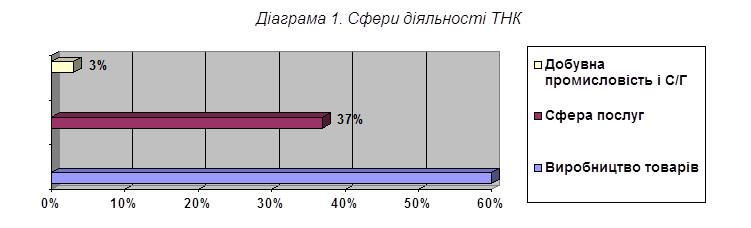 В останні роки активно розвивають свою діяльність на світовому ринку транснаціональні корпорації нових індустріальних країн. Галузева структура ТНК достатньо широка. 60% міжнародних компаній зайняті в сфері виробництва (насамперед вони спеціалізуються на електроніці, автомобілебудуванні, хімічній і фармацевтичній промисловості), 37% - у сфері послуг і 3% - у видобувній промисловості і сільському господарстві (див. діаграму 1).