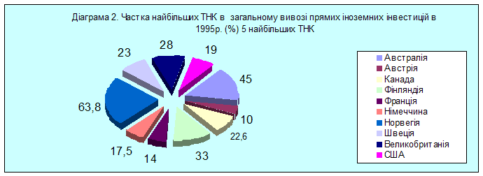 Для головних промислово розвинутих країн саме іноземна діяльність їх ТНК визначає характер зовнішньоекономічних зв'язків. Так, до 40% вартості майна 100 найбільших ТНК (включаючи фінансові) перебуває за межами їхньої країни базування. Якщо зіставити об’єм іноземного (міжнародного) виробництва ТНК з обсягом їхнього експорту, відмежованого від торгівлі в середині фірми, то наприкінці 80-х рр. це співвідношення для США, Японії і ФРН складало відповідно: 4,1:1; 2,6:1; 1,5:3.