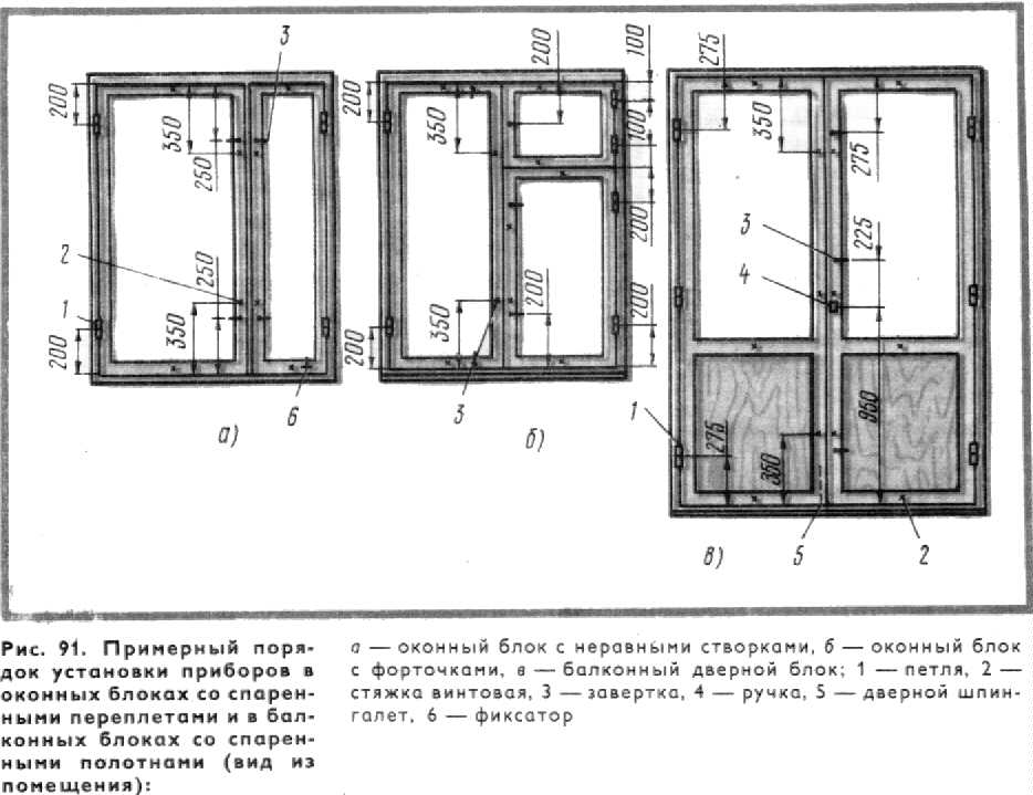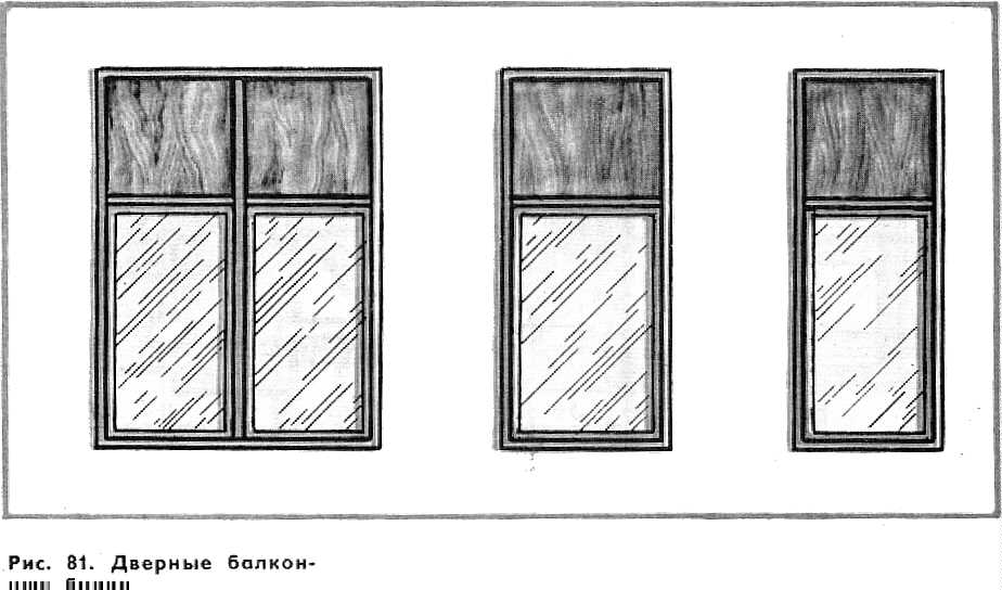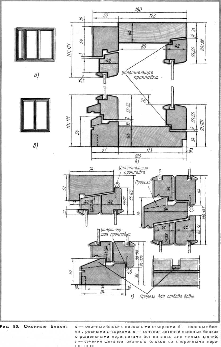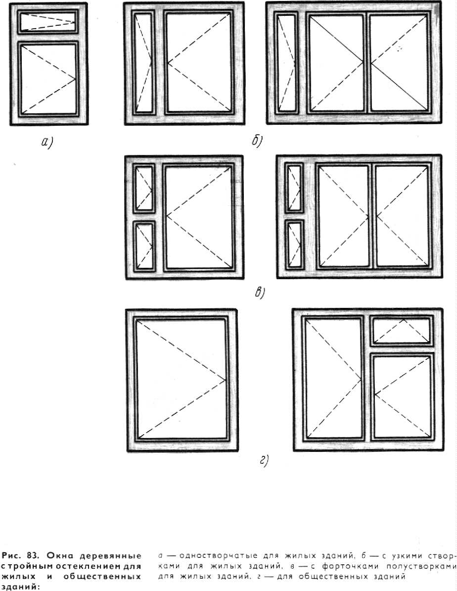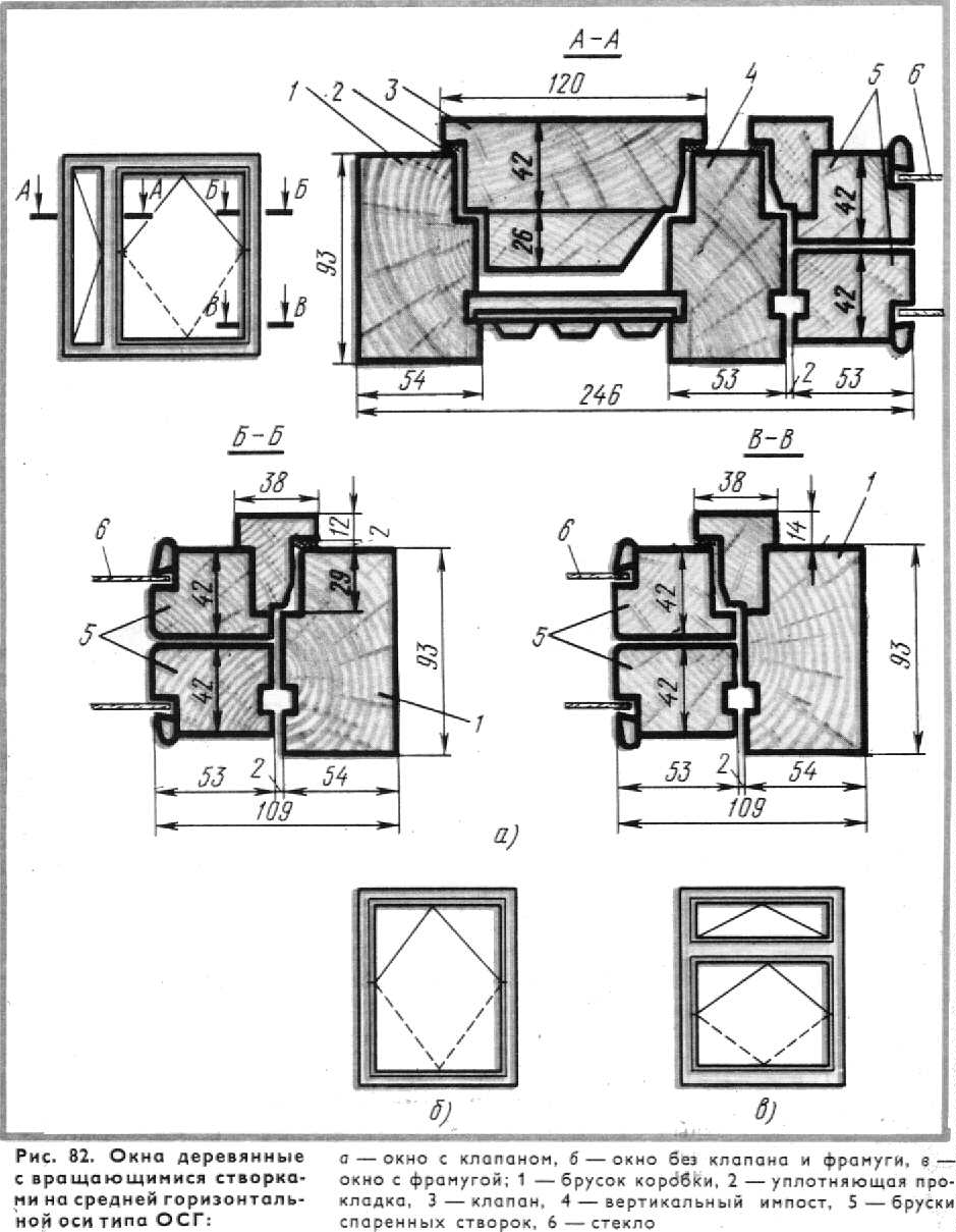 В оконных блоках со спаренными переплетами толщина наружной и внутренней створок одинаковая—42 мм, что упрощает технологию их производства. В связи с тем, что оконные блоки серии С можно изготовлять без импоста, створки делают с правым притвором. Для обеспечения прочности навески больших размеров створок, створки спаренных оконных переплетов высотой более 1400 мм или шириной свыше 800 мм при высоте более 1000 мм навешивают на три петли — две верхние и одну нижнюю. Остальные створки навешивают на две петли. Дверные балконные полотна навешивают на три петли, располагаемые равномерно по высоте полотна. Оконные и дверные балконные блоки для жилых зданий остекляют стеклом толщиной 2,5—-3 мм, а для общественных зданий — толщиной 3—4 мм. Для снижения воздухопроницаемости по периметру притвора в переплетах устанавливают уплотняющие прокладки из шерстяного шнура, пенополиуретана и др. Прокладки должны быть упругими, прочными, свето- и морозостойкими, долговечными. Пенополиуретановые прокладки приклеивают клеем повышенной водостойкости (КН-2, № 88). Шерстяной шнур крепят к наплаву мелкими оцинкованными гвоздями длиной 10—15 мм с шагом 150—200 мм. Чтобы не смять шнур, гвозди забивают в край его, сохраняя по всему периметру створки равномерную толщину шнура. При установке шнур не следует сильно натягивать, так как он от этого вытягивается и теряет свои упругие свойства. Оконные блоки деревянные со спаренными створками, вращающимися на средних осях, для гражданских зданий подразделяются на два типа: вращающиеся на средних горизонтальных осях — среднеподвесные ОСГ, имеющие дополнительно вентиляционные клапаны или верхние фрамуги, и окна со створками, вращающимися на средних вертикальных осях, —среднеповоротные ОСВ. Окна среднеповоротные ОСВ для проемов 18М. 21М и шириной 15М без фрамуг дают возможность делать сплошное ленточное остекление в зданиях каркасной конструкции с двухрядной разрезкой навесных панелей. Окна с проемом шириной 13,5М можно устанавливать рядом и этим самым заполнить проем шириной 27М. Для окон с клапанами принята ширина проема 12М, 15М, 18М, 21М, а высота 12М и 15М; для остальных окон, в том числе и с фрамугами, ширина проема принята 13.5М, 15М, 18М, 21М, высота 18М, 21М. Общий вид и сечения окон показаны на рис. 82.