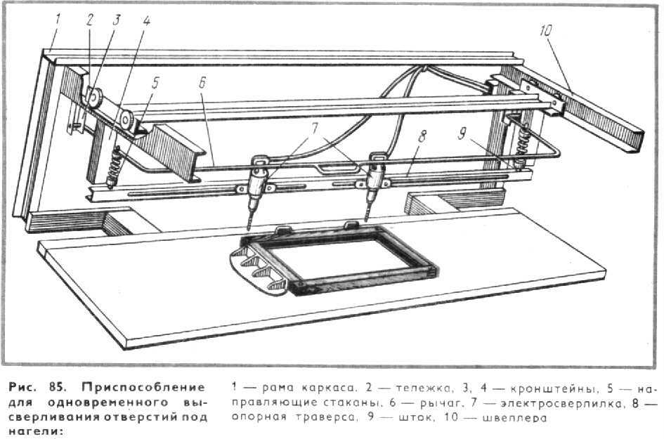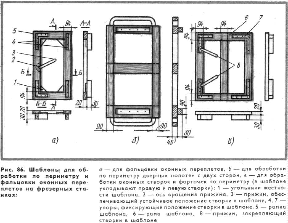 К кронштейнам 4 прикреплены направляющие стаканы 5, через которые проходят штоки 9, соединенные шарнирно с рычагом 6. На штоках 9 расположена траверса 8 с закрепленными на ней электросверлилками. Электросверлилки в зависимости от размеров расстояний между отверстиями могут передвигаться по траверсе. Работающий рычагом 6 устанавливает электросверлилки в нужном положении над собираемой створкой, коробкой, затем опускает рычаг, и электросверлилки, также опускаясь, высверливают отверстия. Собранные изделия укладывают на подстопное место для выдержки, необходимой для схватывания клея. В дальнейшую обработку изделие должно поступать только после схватывания клея в шиповом соединении. Процесс сушки клеевого соединения можно ускорить, применяя токи высокой частоты в сборочном станке после обжатия брусков. Собранные створки, фрамуги и форточки должны иметь припуск до 2 мм на сторону для обработки по периметру и по толщине 0,5 мм для снятия провесов. До вгонки (постановки) в коробки оконные створки, фрамуги, форточки обрабатывают по периметру для придания правильной геометрической формы. Одновременно с обработкой по периметру створки, фрамуги фальцуют, образуя четверть, необходимую для притвора. При обработке форточки по периметру создают профиль обработки, зеркальный профилю брусков и горбыльку, чтобы при постановке форточки на место она точно подходила к профилю брусков и горбыльку. Створки, фрамуги и другие детали на небольших предприятиях по периметру обрабатывают на фрезерных станках с применением шаблонов (рис 86) На более крупных предприятиях створки, фрамуги обрабатывают на линиях.
