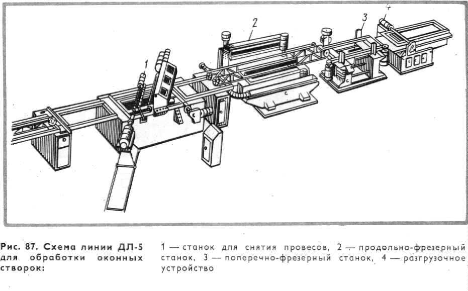 На линии ДЛ-5 (рис. 87) обрабатывают плоскости створок со снятием провесов и по периметру с созданием притвора (четверти). В состав линии входят: станок для снятия провесов, продольно-фрезерные станки и разгрузочное устройство. Линия работает следующим образом. Створки поступают на станок 1 для снятия провесов. На нем под углом 55 расположены два рейсмусовых вала с ножами: один вал над обрабатываемой створкой, а другой под ней. При движении створки ножевыми валами снимаются провесы и зачищается плоскость створки. После обработки плоскостей створка поступает на продольно-фрезерный станок 2, где обрабатываются продольные кромки, после чего на станке 3 обрабатываются поперечные кромки створки. На линии можно обрабатывать створки высотой до 1800 мм, шириной 475—850 мм и толщиной 42: 62 мм.