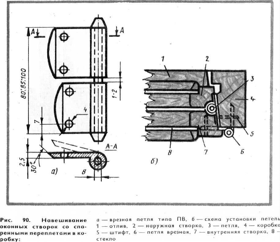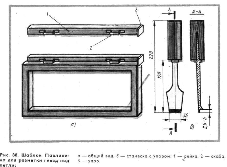 Вгонку и навешивание форточек в створку производят на рабочем месте. В связи с тем, что форточку обрабатывают на фрезерном станке в шаблоне, дополнительных работ по пригонке форточки к створке не требуется. Отлив на форточке не ставится, так как в нижнем бруске форточки отлив составляет одно целое с бруском. Отлив, нащельники, заранее прирезанные в размер, во внутренней и наружной створках ставят на рабочем месте. Отлив (врезной) ставят на клее повышенной водостойкости с креплением шурупами. Нащельник крепят к створке также на клее с привертыванием шурупами. Нащельник высотой до 1200 мм крепят 4 шурупами, а высотой 1200—1800 мм—5—6 шурупами. Коробки собирают в сборочном станке/ Коробки без предварительной подгонки брусков собирают следующим образом. В станок укладывают бруски коробки, обжимают их, следя за тем, чтобы в шиповом соединении бруски плотно подходили один к другому. Правильность сборки коробки проверяют шаблоном с угла на угол. После этого в местах шиповых соединений высверливают отверстия под нагели, которые ставят на клею заподлицо с плоскостью коробки. Трудоемкой операцией является навешивание створок с врезкой петель. На большинстве деревообрабатывающих предприятий эта операция механизирована. При отсутствии станков для врезки петель используют шаблон Павлихина (рис. 88), представляющий собой рейку 1 с упором 3 и двумя скобами 2 с заточенными фасками. Размеры скоб соответствуют размерам петель. При разметке шаблон кладут на кромку створки по упору, а затем легким ударом по скобе переносят ее отпечаток на створку и по нему в дальнейшем прорезают гнездо под петлю. Аналогичным образом делают разметку на коробках, а также дверных полотнах. По полученной разметке стамеской с упором прорезают гнезда под петли. Упор стамески позволяет заглубить лезвие лишь на заданный размер. Глубина гнезда под петлю должна точно соответствовать толщине ее, с тем чтобы после установки поверхность петли была заподлицо с древесиной. Вгонка и навешивание створок в коробку производится на специальных столах, имеющих длину и ширину, соответствующую наибольшему размеру оконного блока, и высоту до 900 мм. На предприятиях с большим объемом производства вгонка и навеска створок производится на конвейерах с заданным ритмом.