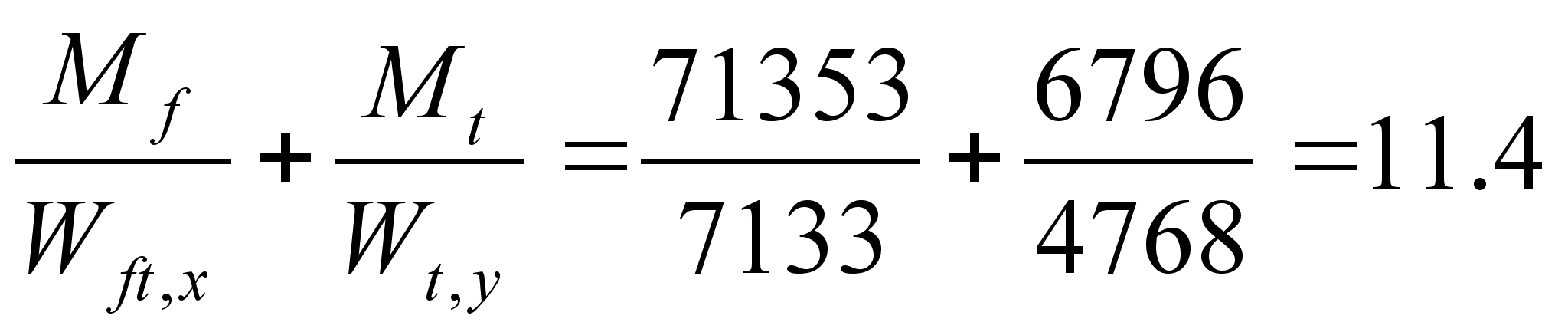 где Ix , Ift и Ic – соответственно моменты инерции тормозного листа, верхнего пояса балки и наружного швеллера . Момент инерции площади ослабления Iy0 = dc*tf*(xc – a)2 + d0*tf*(xc + a)2 = 2.5*1.4*(60 – 10)2 + 2.5*1.4*(60+10)2 = = 25 900 cм4 , где а = 100 мм. Момент инерции площади сечения нетто относительно у – у Iy,nt = Iy – Iy0 = 383 539 – 25 900 = 357 639 cм4. Момент сопротивления для крайнего волокна в верхнем поясе подкрановой балки Wt,y