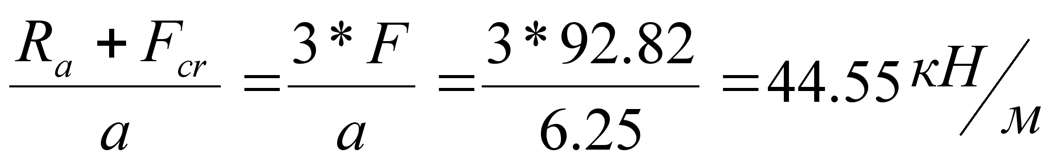 2.Подсчет нагрузок на балку. Вертикальное давление колеса крана : F = Fn * f * kd * * n = 85*1.1*1.1*0.95*0.95 = 92.82 кН. Здесь – Fn = 85 кН – нормативная сила вертикального давления колеса крана на рельс, принятые для стандартных кранов по ГОСТ6711–81 ; – f = 1.1 – коэффициент надежности по нагрузке согласно п.4.8 СНиП 2.01.07 – 85 [1] – kd1 = 1.1 – коэффициент динамичности для группы режима работы крана 7К – = 0.95 – коэффициент сочетаний нагрузок по п.4.17 [1] для группы режима крана 7К . – f = 0.95 – коэффициент надежности по назначению для зданий 11 класса ответственноси Нормативное значение горизонтальной нагрузки, направленное поперек кранового пути, на каждое ходовое колесо крана, вызываемое перекосами мостового крана и принимаемое при расчете подкрановых балок с группой режима работы 7К составит : Tn = 0.1*Fn = 0.1*85 = 8.5 кН. Горизонтальное боковое давление колеса крана от поперечного торможения тележки : T=Tn *f *kd2 * n = 8.5*1.1*1.1*0.95*0.95 = 9.28 кН, где kd2 = 1.1 – коэффициент динамичности по п.4.9. норм [1]. 3.Определение максимальных усилий . Согласно теореме Винклера, наибольший изгибающий момент от системы подвижных грузов Мmax возникает в том случае, когда середина балки делит пополам расстояние между равнодействующими всех грузов Rf и ближайшим критическом грузом Rcr [8]. При схеме загружения положение равнодействующих четырех сил Rf = 4F относительно оси левого крайнего груза z будет : М1 = 0 ;