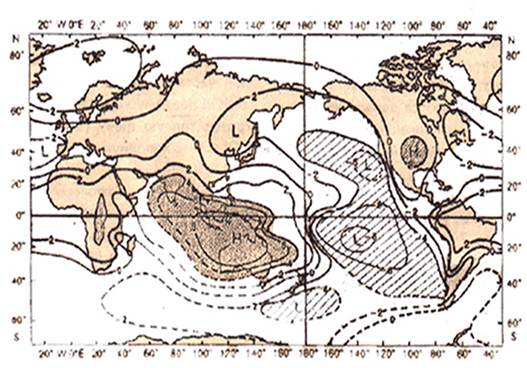 Рис. 1 Поле коэффициентов корреляции r между средними годовыми величинами атмосферного давления станции «Дарвин» (Австралия) и значениями давления в других пунктах Земли. На рис. 1 показаны изолинии коэффициентов r ( увеличены в 10 раз). Для представленного случая в зоне от 300 с.ш. до 350 ю.ш. в Восточном полушарии коэффициенты корреляции положительные, а в Западном полушарии отрицательные. Коэффициент корреляции r в рассматриваемом случае является мерой линейной статистической связи между многолетними величинами атмосферного давления в одном пункте (в нашем случае станция «Дарвин» (Австралия)) и другими пунктами земного шара. Чем ближе его величина к 1 или –1, тем теснее связь между величинами атмосферного давления в исследуемых пунктах. Имеются своего рода два центра действия противоположного знака: австралийско – индонезийский и южнотихоокеанский. Оба расположены в тропиках Южного полушария ( отсюда и название Южное колебание). Очаг наиболее тесной отрицательной корреляции (r < - 0,8 ) располагается вблизи станции «Таити» (170 ю.ш. , 1500 з.д.), поэтому в качестве индекса нужного колебания SOI ( South Oscillation Index) используют разность нормализованных аномалий давления на метеостанцях «Таити» и «Дарвин». При SOI £ 0 давление понижено над Тихим океаном и повышенно над Индийским океаном, при SOI ³ 0 картина обратная. При первом взгляде на многолетние кривые индекса SOI, который фиксировался непрерывно с 1866 года, создается впечатление, что чередование его фаз носит случайный характер. Однако спектральный анализ показал наличие ярко выраженных преимущественных периодов: 6; 3,6; 2,8; 2,4 года ( рис. 2, красная кривая 1). Имеется также небольшой пик около 12 лет. Важно, что все эти преобладающие периоды ( за исключением периода 2,8 г.) примерно кратны периоду 1,2 г. ( номера гармоник nk = 5; 3; 2 и 10 соответственно).