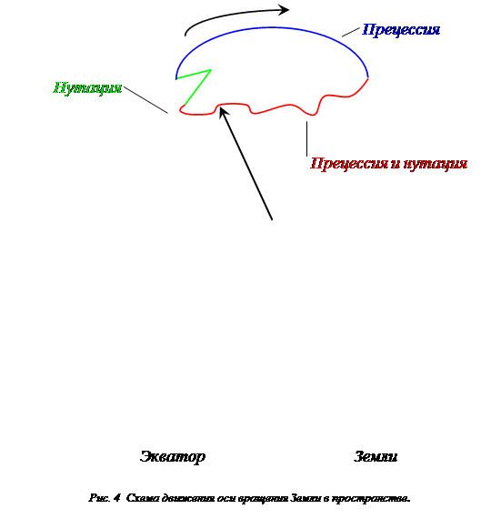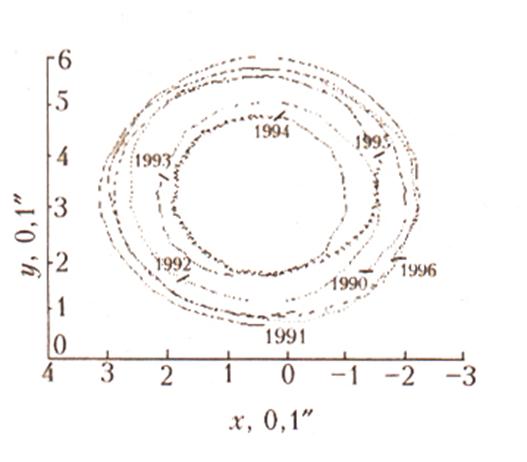 Вершина конуса совпадает с центром Земли. Так как момент импульса Земли очень велик (59 . 1032 кг . м2 . с-1 ), скорость прецессии очень мала ( период равен примерно 26 тыс. лет). Угол наклона земной оси к эклиптике при прецессии не меняется, оставаясь равным 660 33’ , и географические координаты пунктов на Земле остаются без изменений. Моменты сил притяжения, которые действуют на экваториальные вздутия, меняются в зависимости от изменения положения Луны и Солнца по отношению к Земле. Когда Луна и Солнце находятся в плоскости земного экватора, моменты сил исчезают, а когда склонения Луны и Солнца максимальны, достигают наибольшей величины. Вследствие таких колебаний моментов сил тяготения наблюдается нутация земной оси. Нутационное движение складывается из ряда небольших периодических колебаний. Главнейшее из них имеет период 18,6 года – период обращения лунных узлов (точек пересечения орбиты Луны с эклиптикой). Движение с этим периодом происходит по эллипсу. Большая ось эллипса перпендикулярна направлению прецессионного движения и равна 16,4” (рис. 4). Малая ось параллельна направлению прецессионного движения и равна 13,7”. Таким образом, ось вращения земли описывает на небесной сфере волнообразную траекторию, точки которой находятся на угловом расстоянии в среднем около 230 27’ от полюса эклиптики. Помимо лунно-солнечной прецессии и нутации, ось вращения Земли изменяет свое положение также и относительно тела Земли. Это явление называется движением полюсов. Оно приводит к изменению координат пунктов на Земле. КОЛЕБАНИЯ ЗЕМЛИ. Происходящее в процессе ЭНЮК перераспределение воздушных и водных масс приводит к тому, что ось наибольшего момента инерции отклоняется по меридиану Австралии при Эль-Ниньо и по меридиану Таити при Ла-Нинья. Земля, являясь гироскопом, преобразует качания этой оси в движение оси наибольшего момента инерции Земли по конусу относительно оси суточного вращения. Из-за этого точки, в которых ось вращения пересекает земную поверхность – мгновенные полюсы Земли, - движутся. Они перемещаются по земной поверхности вокруг своего среднего положения в направлении вращения Земли, т.е. с запада на восток. Фигура, строение и физические свойства Земли таковы, что период свободных колебаний полюсов Земли равен 1,2 года. Помимо этого, чандлерова, движения полюсов имеется еще и вынужденное движение полюсов периодом 1 год. Сложение этих двух движений порождает биения, в результате которых радиус траектории полюса меняется от максимального до минимального с периодом примерно 6 лет ( рис. 5).