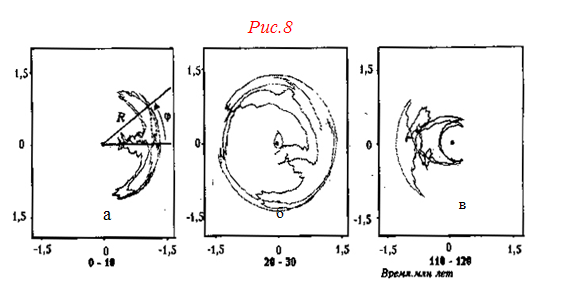 На рисунке 7 изображены результаты численного моделирования эволюции орбиты астероида, отвечающей резонансу 1:3. Они демонстрируют, что на протяжении миллионов лет возникают сильные прерывистые всплески значений эксцентриситета орбиты. В период такого всплеска астероид может пересечь орбиту Марса и под влиянием тяготения этой планеты оказаться выброшенным из устойчивой зоны, превратившись в астероид-бродягу. Благодаря этому возможно образование лакун в распределении орбит астероидов. НЕУСТОЙЧИВОСТЬ В ДВИЖЕНИИ КОМЕТ. Возмущения, вызываемые наличием планет, сильно влияют и на движение комет. В частности, последнее прохождение кометы Галлея в 1985 г. вызвало появление многочисленных работ по динамике движения комет с большим эксцентриситетом орбит. Предсказания появление кометы Галлея всегда были вызовом астрономам, с того самого момента, когда Эдмунд Галлей предсказал в 1705 г., что комета вернется примерно через 75 лет. Действительно, с тех пор появления кометы были регулярными с периодом 75-80 лет, но точное значение периода зависит от возмущающего действия на орбиту кометы со стороны планет, оказывающихся поблизости в данное время. По случаю последнего появления кометы были сделаны новые расчеты ее орбиты с использованием всей мощи современной вычислительной техники. Их точность составляла один год по шкале времени. Выяснилось, что расчеты очень хорошо совпадают с предшествующими наблюдениями появления кометы вплоть до 1403 г. с периодом 86 лет. Однако историкам астрономии удалось датировать появления кометы Галлея, начиная с 163 г. И тут выяснилось, что этот момент времени как раз соответствует границе зоны неустойчивости. Если расхождение расчетов и наблюдений на промежутке времени в 615 лет, считая от 163 г., равно всего двумстам дням, то за последующие семьсот лет – до 1403 г. – увеличивается до пяти лет. Все эти особенности движения кометы Галлея нашли свое объяснение в том, что эти движения неустойчивы. В рамках простой модели, в которой влияние Юпитера описано короткими импульсами в моменты прохождения кометы, было показано, что орбита кометы Галлея соответствует сепаратиссе на рисунке 8б. Комета Галлея – рядовая комета Солнечной системы. Во всех случаях проблема одна и та же: кометы «смертны». Это означает, что в результате развития неустойчивости орбиты комета может быть рано или поздно выброшена за пределы Солнечной системы.
