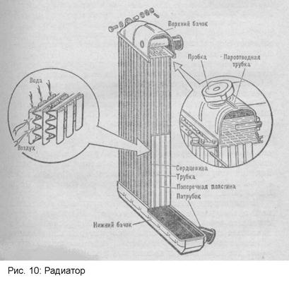 После охлаждения нагретого двигателя возникает опасность сдавливания трубок радиатора в результате создавшегося разрежения. Для предотвращения этого явления служит воздушный клапан пробки радиатора (рис. 11, б), который, открываясь при разрежении 0,001 ... 0,013 МПа, пропускает внутрь его воздух. Жалюзи служат для регулирования интенсивности обдува радиатора встречным потоком воздуха. Они состоят из отдельных пластин, укрепленных шарнирно впереди радиатора (см. рис. 9). Управляют жалюзи рукояткой, выведенной в кабину. При затягивании рукоятки пластины, поворачиваясь на шарнирах, уменьшают встречный поток воздуха, поступающий к радиатору.