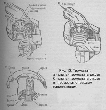Вентилятор. Для усиления потока воздуха, проходящего через сердцевину радиатора, служит вентилятор. Его обычно монтируют на одном валу с водяным насосом. Он состоит из крыльчатки с четырьмя или шестью лопастями, привернутыми к ступице. Вал вентилятора одновременно является валом водяного насоса и установлен в его корпусе на шариковых подшипниках. Привод водяного насоса и вентилятора осуществляется от шкива коленчатого вала клиновидным ремнем. В двигателе ЗиЛ-130 ремень охватывает также шкив насоса гидроусилителя рулевого управления. Термостат. В период пуска двигателя для уменьшения износа желательно возможно быстрее прогреть его до температуры 80 ... 90 °С и при дальнейшей эксплуатации поддерживать эту температуру. Для этой цели служит термостат, его устанавливают в патрубке полости впускного трубопровода.