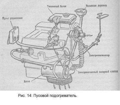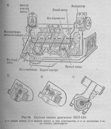 (рис. 14). Котел подогревателя постоянно соединен с системой охлаждения двигателя. Топливный бачок заполняют топливом, применяемым для двигателя. Топливо самотеком поступает в камеру сгорания котла через электромагнитный запорный клапан. Воздух в камеру сгорания подается электровентилятором. Первоначальное зажигание горючей смеси осуществляется свечой накаливания, а дальнейшее горение — от ранее зажженного пламени. Отработавшие газы направляются патрубком на поддон для подогрева масла. Включатели свечи зажигания, вентилятора и электромагнитного клапана и контрольная спираль находятся на пульте управления. -Система смазки: Между отдельными деталями двигателя, поверхности которых перемещаются одна относительно другой, возникает сила называемая силой терния. На преодоление сил трения затрачивается часть мощности двигателя; помимо этого трение приводит к износу деталей и их нагреву. Уменьшение сил трения достигается улучшением качества обработки поверхности, применением антифрикционных сплавов, шариковых и роликовых подшипников. Одним из наиболее эффективных способов уменьшения сил трения является смазка. Смазка, находящаяся между трущимися поверхностями, разделяет их, заменяя непосредственное трение деталей трением слоев смазки между собой. Помимо этого, масло охлаждает смазываемые детали и уносит твердые частицы, попавшие между ними. В зависимости от размещения и условий работы деталей масло может подаваться под давлением, разбрызгиванием и самотеком. В автомобильных двигателях применяются все три способа подвода масла, при этом к наиболее нагруженным деталям масло поступает под давлением, а к остальным — разбрызгиванием и самотеком. Для хранения, подвода, очистки и охлаждения масла применяют ряд приборов, маслопроводов и каналов, образующих систему смазки (система смазки двигателя ЗиЛ-130 на рис. 15).