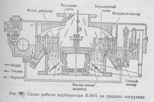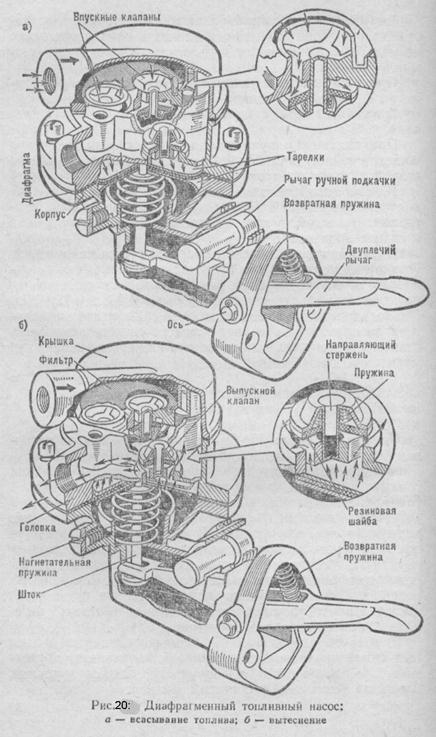 Чтобы предотвратить возможность работы двигателя с чрезмерно большой частотой вращения коленчатого вала, в систему питания грузовых автомобилей включен ограничитель частоты вращения коленчатого вала. Карбюратор К-88АМ двигателя ЗИЛ-130 имеет две смесительные камеры, каждая из которых обслуживает четыре цилиндра. При работе двигателя на средних нагрузках топливо из поплавковой камеры поступает через главные жиклеры, а затем через жиклеры полной мощности в эмульсионные каналы (рис. 19). В этих каналах к топливу подмешивается воздух, поступающий из воздушных жиклеров и жиклеров системы холостого хода. Образовавшаяся эмульсия попадает в смесительные камеры через кольцевые щели малых диффузоров. Поддержание постоянного состава обедненной смеси происходит за счет торможения топлива воздухом. Топливный насос. На автомобилях карбюратор расположен выше топливного бака и подача топлива осуществляется принудительно. Для принудительной подачи топлива из бака к карбюратору на двигателе установлен топливный насос диафрагменного типа. Насос (рис. 20) состоит из трех основных частей! корпуса, головки и крышки. В корпусе на оси размещен двуплечий рычаг с возвратной пружиной и рычаг ручной подкачки. Между корпусом и головкой насоса закреплена диафрагма, собранная на штоке, имеющем две тарелки. Двуплечий рычаг воздействует на шток через текстолитовую упорную шайбу. Под диафрагмой установлена нагнетательная пружина. В головке насоса расположены два впускных и один выпускной клапаны. Клапаны имеют направляющий стержень, резиновую шайбу и пружину. Сверху впускных клапанов расположен сетчатый фильтр. Топливный насос диафрагменного типа приводится в действие непосредственно от эксцентрика распределительного вала . При набегании эксцентрика или штанги на наружный конец двуплечего рычага внутренний конец его, перемещаясь, прогибает диафрагму вниз и над ней создается разрежение (см. рис. 20, а). Под действием создавшегося разрежения топливо из бака поступает по трубопроводу к впускному отверстию насоса и проходит через сетчатый фильтр к впускным клапанам, при этом нагнетательная пружина насоса сжимается. Когда выступ эксцентрика сходит с наружного конца двуплечего рычага, диафрагма под действием нагнетательной пружины перемещается вверх и в камере над ней создается давление. Топливо вытесняется через нагнетательный клапан в выпускной канал и затем по трубке в поплавковую камеру карбюратора (см. рис. 20, б).