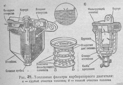 При заполненной поплавковой камере игольчатый клапан закрывает отверстие в седле и в топливопроводе, идущем от насоса к карбюратору, создается давление, которое распространяется в полость над диафрагмой. В этом случае диафрагма насоса остается в нижнем положении, так как нагнетательная пружина не может преодолеть создавшееся давление, и двуплечий рычаг под действием эксцентрика и возвратной пружины качается вхолостую. Для заполнения поплавковой камеры карбюратора топливом при неработающем двигателе служит рычаг ручной подкачки, расположенный сбоку корпуса насоса. Рычаг имеет валик со срезанной частью и возвратную пружину. В отжатом положении срез валика находится над коромыслом и не воздействует на него. При перемещении рычага ручной подкачки валик краями вырезанной части надавливает на внутренний конец двуплечего рычага и перемещает диафрагму вниз. Рычагом ручной подкачки можно пользоваться тогда, когда эксцентрик освободил наружный конец двуплечего рычага . Топливные фильтры и отстойники. Топливо, поступающее к жиклерам карбюратора, не должно иметь механических примесей и воды, так как примеси засоряют отверстия жиклеров, а замерзшая в зимнее время вода явится причиной прекращения подачи топлива. Для очистки топлива в системе питания двигателя предусмотрена установка фильтров и отстойников. Сетчатые фильтры устанавливают в заливных горловинах топливных баков, в корпусе диафрагменного насоса и во входных штуцерах поплавковой камеры карбюратора.