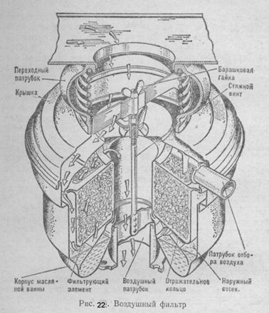 Топливо, проходя через щели фильтрующего элемента, дополнительно очищается от механических примесей, которые оседают на фильтрующем элементе. Фильтр тонкой очистки топлива (рис. 21, б) устанавливают перед карбюратором. Он состоит из корпуса, стакана-отстойника, фильтрующего элемента с пружиной и зажимом стакана. Фильтрующий элемент может быть выполнен керамическим или из мелкой сетки, свернутой в виде рулона. Топливо, подаваемое диафрагменным насосом, поступает в стакан-отстойник. Часть механических примесей выпадает в виде осадка в стакане-отстойнике, а остальные примеси задерживаются на поверхности фильтрующего элемента. Фильтр грубой очистки топлива установлен у топливного бака и предназначен для предварительной очистки топлива, поступающего в топливо подкачивающий насос. Состоит он из корпуса, отстойника, крышки с подводящими штуцерами, сетчатого фильтрующего элемента, сливной пробки и пробки выпуска воздуха из системы. Фильтр тонкой очистки топлива предназначен для очистки топлива от мелких частиц. Он состоит из двух колпаков, крышки и двух фильтрующих элементов. В нижней части каждого колпака ввернута сливная пробка. Сменный фильтрующий элемент изготовлен из бумаги. В крышке фильтра имеется сливной клапан, через который сливается часть топлива вместе с воздухом, попавшим в систему низкого давления. Воздушный фильтр. Автомобиль зачастую эксплуатируется в условиях сильного запыления воздуха. Пыль, попадая в цилиндры двигателя вместе с воздухом, вызывает ускоренный износ как цилиндров, так и поршневых колец. Очистка воздуха, поступающего для приготовления горючей смеси, осуществляется в воздушном фильтре. На автомобиле ЗИЛ-130 применяют воздушные фильтры инерционно-масляного типа. Фильтр (рис. 22) состоит из корпуса масляной ванны, крышки с патрубком, фильтрующего элемента, изготовленного из металлической сетки или капронового волокна, стяжного винта с барашковой гайкой. Воздух под действием разрежения, создаваемого работающим двигателем, через патрубок попадает во входную кольцевую щель и, двигаясь по ней вниз, ударяется о масло, к которому прилипают крупные частицы пыли. При дальнейшем движении воздух подхватывает частицы масла и смачивает им фильтрующий элемент. Масло, стекающее с фильтрующего элемента, смывает частицы пыли, осевшие на отражателе. Воздух, проходя через фильтрующий элемент, полностью очищается от механических примесей и по центральному патрубку поступает в смесительную камеру карбюратора. Фильтр устанавливают при помощи переходного патрубка непосредственно на карбюраторе и соединяют с карбюратором при помощи воздушного патрубка. Топливный бак. Для хранения запаса топлива, необходимого для работы автомобиля, установлен топливный бак. Он состоит из двух половинок, штампованных из листовой стали и соединенных сваркой. Внутри бака, для увеличения жесткости и уменьшения ударов топлива при