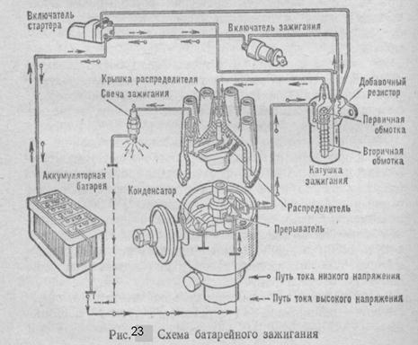 Преобразование тока низкого напряжения в ток высокого напряжения и распределение его по цилиндрам двигателя осуществляется приборами зажигания. Система зажигания состоит из источников тока низкого напряжения, катушки зажигания, прерывателя-распределителя, конденсатора, свечей зажигания, включателя зажигания и проводов низкого и высокого напряжений (рис. 23). В системе зажигания имеется две цепи — низкого и высокого напряжения. Цепь низкого напряжения питается от аккумуляторной батареи или от генератора. В эту цепь, кроме источников тока, последовательно включены включатель зажигания, первичная обмотка катушки зажигания с добавочным резистором и прерыватель. Цепь высокого напряжения состоит из вторичной обмотки катушки зажигания, распределителя, проводов высокого напряжения, свечей зажигания. Образование тока высокого напряжения в катушке зажигания основано на принципе взаимоиндукции. При включенном выключателе зажигателя и сомкнутых контактах прерывателя ток от аккумуляторной батареи или генератора поступает на первичную обмотку катушки зажигания, вследствие чего вокруг нее образуется магнитное поле. При размыкании контактов прерывателя ток в первичной обмотке катушкн зажигания и магнитный поток вокруг нее исчезают. Исчезающий магнитный поток пересекает витки вторичной и первичной обмоток катушки зажигания и в каждом из них возникает небольшая э. д. с. Благодаря большому числу витков вторичной обмотки, последовательно соединенных между собой, общее напряжение на ее концах достигает 20 ... 24 кВ. От катушки зажигания, через провод высокого напряжения, распределитель и провода ток высокого напряжения поступает к свечам зажигания, в результате чего между электродами свечей возникает искровой разряд, зажигающий рабочую смесь.