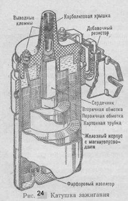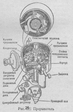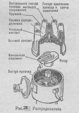 Сердечник изготовляют из отдельных изолированных друг от друга полосок трансформаторной стали, чтобы уменьшить образование вихревых токов. Нижний конец сердечника установлен в фарфоровый изолятор. Внутри катушка зажигания заполнена трансформаторным маслом. Добавочный резистор состоит из спирали, керамических гнезд и двух шин. Сопротивление колеблется от 0,7 до 40 Ом. Один конец резистора соединен шиной с клеммой ВК, а другой — с ВКБ. При малой частоте вращения коленчатого вала двигателя контакты прерывателя продолжительное время находятся в замкнутом состоянии, сила тока в первичной цепи возрастает, резистор нагревается, увеличивается сопротивление в цепи, в катушку зажигания поступает ток небольшой силы, этим она предохраняется от перегрева. Когда частота вращения коленчатого вала двигателя увеличивается, время сомкнутого состояния контактов уменьшается, сила тока в первичной цепи уменьшается, нагрев и сопротивление добавочного резистора уменьшаются, что препятствует понижению напряжения во вторичной цепи. При включении стартера резистор закорачивается, и пуск двигателя облегчается. Прерыватель-распределитель. Образование тока высокого напряжения и распределение его по цилиндрам двигателя для своевременного воспламенения рабочей смеси должно соответствовать порядку работы цилиндров. Чтобы индуктировать ток высокого напряжения во вторичной обмотке катушки зажигания, необходимо периодически размыкать первичную цепь батарейного зажигания, что и выполняет прерыватель. Для распределения тока высокого напряжения по цилиндрам соответственно порядку работы двигателя служит распределитель. Оба эти прибора объединены в один — прерыватель-распределитель.