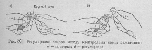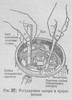 Крепится конденсатор на корпусе снаружи или на подвижном диске прерывателя. Емкость конденсатора 0,17 ... 0,25 мкФ. Конденсаторы из металлизированной бумаги обладают способностью самовосстанавливаться при пробое диэлектрика за счет заполнения отверстия маслом. Большое влияние на работу батарейного зажигания оказывает зазор между контактами прерывателя. Нормальная работа батарейного зажигания будет при зазоре между контактами прерывателя в пределах 0,35... ... 0,45мм. Если зазор будет большим, то время замкнутого состояния контактов уменьшится и сила тока в первичной обмотке катушки зажигания не успеет возрасти до требуемого значения и, как следствие этого, э. д. с. вторичной цепи не будет достаточной. Кроме того, при большой частоте вращения коленчатого вала будут возникать перебои в работе двигателя.